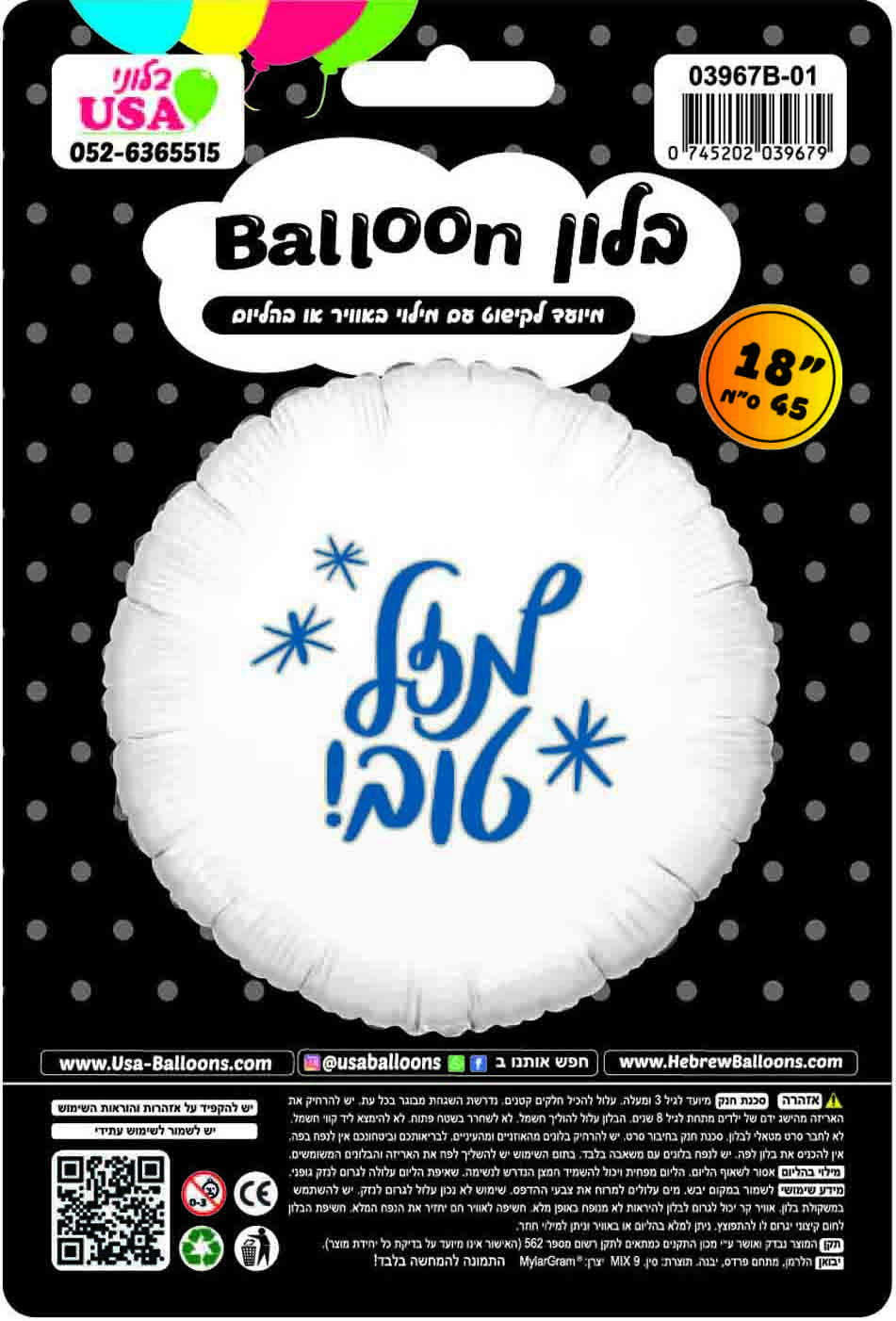 Mazel Tov Round White/Blue Hebrew Foil Balloon